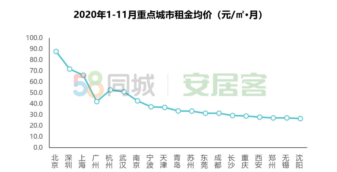 在新冠肺炎疫情影响下,全国租房市场出现了整体的萎缩,但重点城市的租金仍然保持平稳。今年1-11月,全国重点19城的平均租金在41.2元/㎡月,与去年相比波动不大。