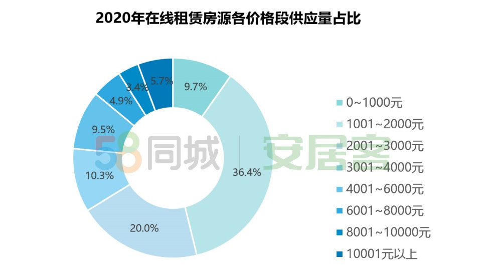 据58同城、安居客平台统计数据显示,从全国范围的在线租赁房源租金在2000元/月以上的房源供应量占比为53.9%。今年房源的租金价格在1001-2000元/月的占比最高,为36.4%,租金在2001-3000元/月的房源占比两成。