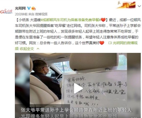 该乘客拍下图片发了朋友圈和抖音,随即被各媒体转载。在这样一个寒冬,成都的一张小纸条给了大家大大的温暖,这位顺风车司机也因提醒乘客“吃早餐”走红网络,司机称,平常送孙子上学都会顺路带在附近上班的年轻人,发现很多年轻人起早上班走得急常常不吃早饭,于是便在车里准备了一些吃的和一张提醒纸条,希望年轻人注意身体养成吃早餐的好习惯。