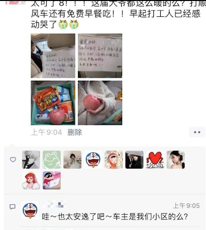 近日,成都一位乘客打顺风车发现,在车辆后排的小黑板上,写着“乘客您好,今年冬天很冷,盒子里准备了苹果、饼干和牛奶、八宝粥和暖宝宝,没吃早餐的朋友免费自取哦!”