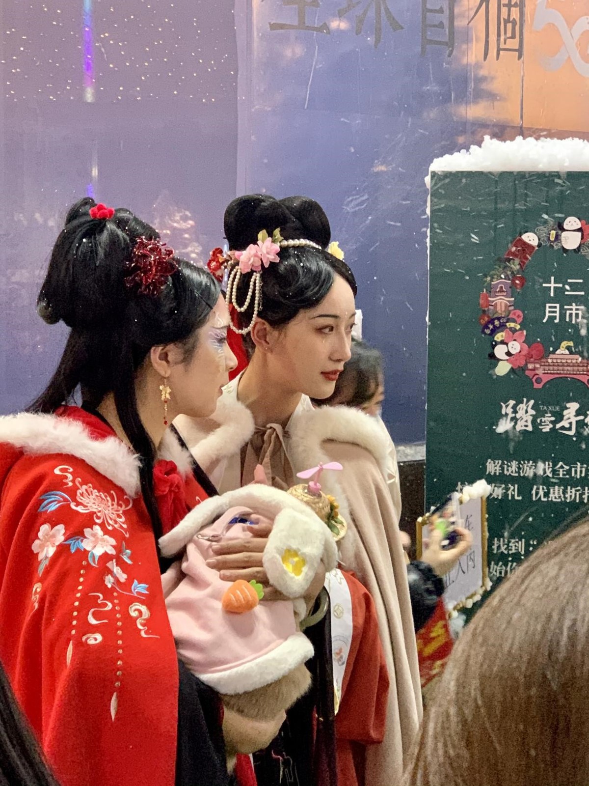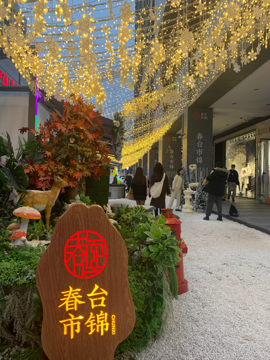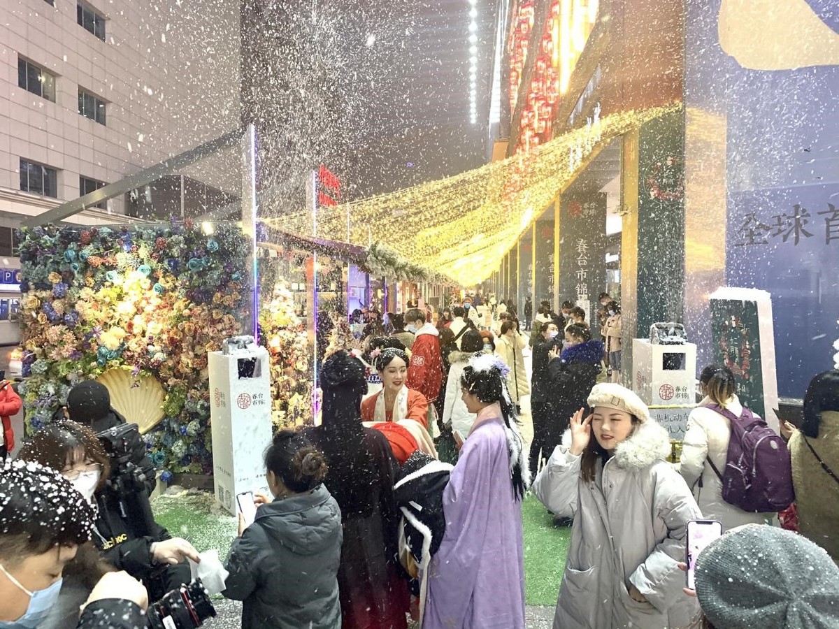 基于此背景,寓意为“熙来攘往登春台,市井烟火最成都”的春台市锦在今年9月底正式亮相。217米的长街上一站式汇聚近40余家优质商家,在这里“推门就是美好生活”正在成为成都锦江触手可及的幸福体验。12月25日晚,在春台市锦看一场“雪”。,应景的雪景营造,配合解谜游戏互动的趣味活动——“踏雪寻梅”一一上演,活动中,汉服爱好者们穿梭于街巷之中纷纷寻找“梅”字意向商品,以取胜获得福利。活动现场,他们打卡拍照,或开启一场云直播,巷内巷外,线上线下,一片热闹。“薅羊毛”的消费者们也参与其中,纷纷为好物买单。