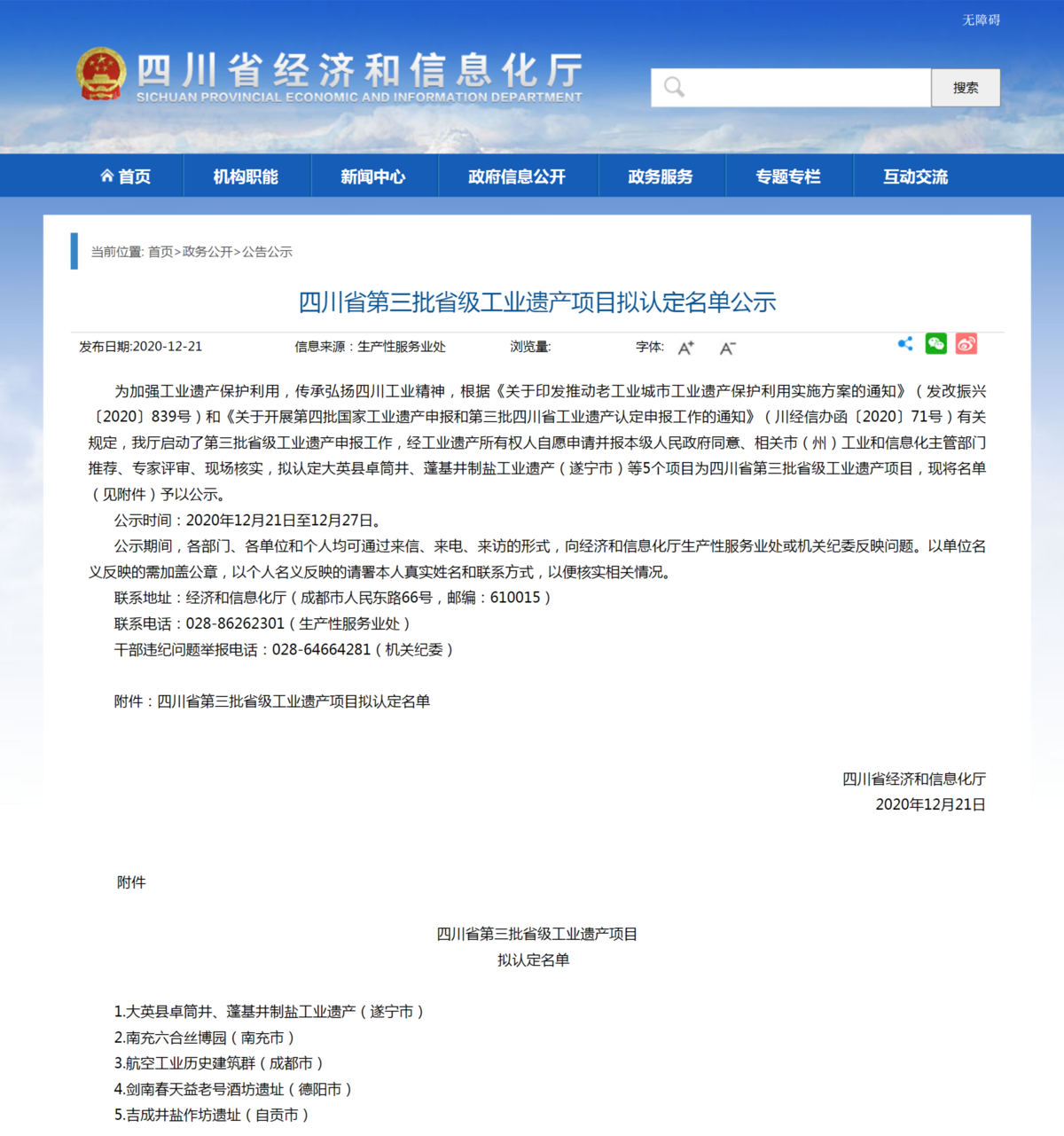 同时,省经信厅发布了《四川省第三批省级工业遗产项目拟认定名单》,拟认定大英县卓筒井、蓬基井制盐工业遗产(遂宁市)等5个项目为四川省第三批省级工业遗产项目,公示时间为12月21日至12月27日。