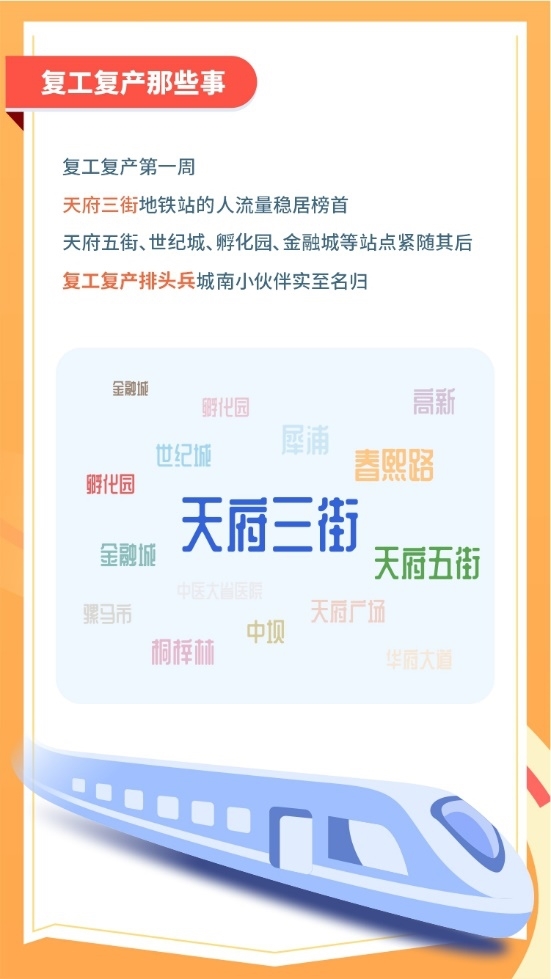 新冠疫情防控新常态下,复工复产第一周,天府三街地铁站的客流量稳居榜首,天府五街、世纪城、孵化园、金融城等站点紧随其后。