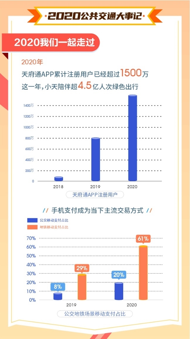 截至2020年12月底,天府通APP累计注册用户超过1500万,全年服务用户超过4.5亿人次。越来越多市民选择移动支付方式乘坐公交、地铁,其中地铁场景使用移动支付的用户已达到61%,这一数据在2019年为29%。