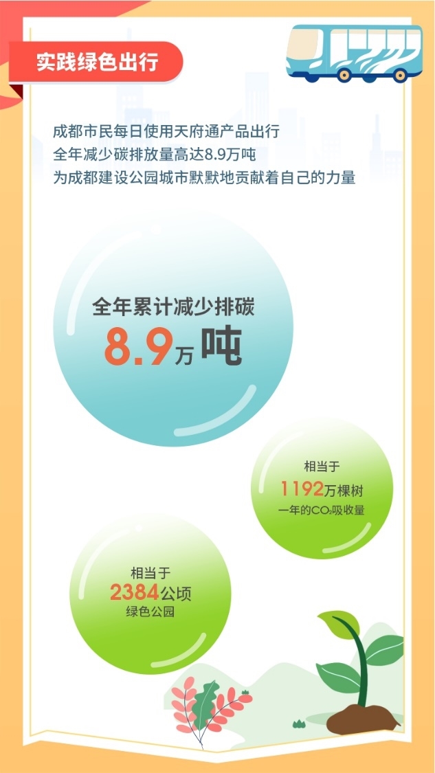 成都市民每日使用天府通产品出行,全年减少碳排放量达8.9万吨,相当于1192万棵树一年的二氧化碳吸收,这些树木可以建设2384公顷的公园绿化。