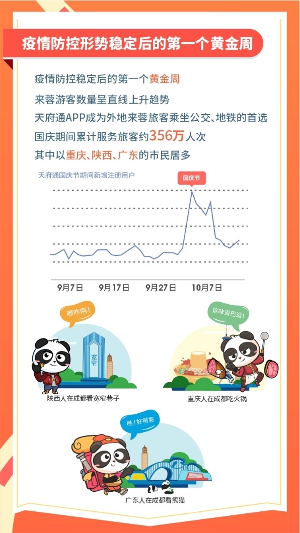 疫情防控形势稳定后的第一个黄金周,来蓉旅客数量呈直线上升趋势,天府通App成为外地来蓉旅客乘坐公交、地铁的首选,国庆期间累计服务旅客356万人次,其中以重庆、陕西、广东的市民居多。