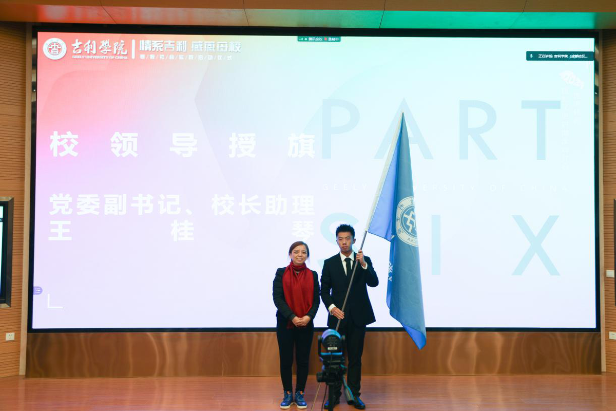 最后,吉利学院党委副书记、校长助理王桂琴为本次社会实践队代表授旗。“有了旗帜,就有了方向,学校的实践方案让我更懂“感恩”这个词,常怀母校,回报家乡的同时更会以我是一名吉利学院的学子而感到骄傲。”来自吉利学院智能科技学院学生宛长春在接旗后激动地表示。