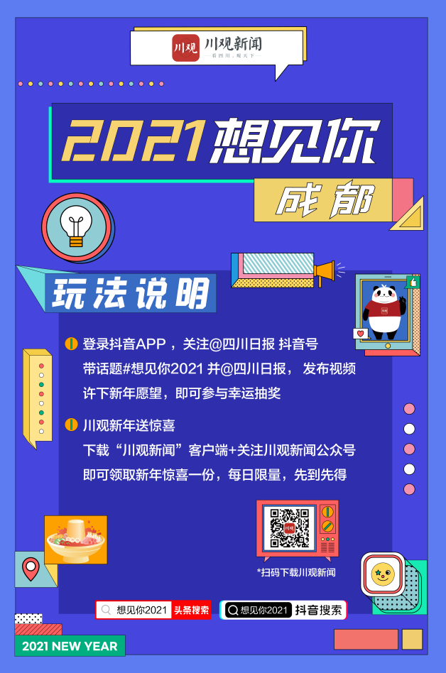 活动二:带指定话题 #想见你2021# 并@四川日报,发布自己的新年愿望视频,即可参与线上抽奖。