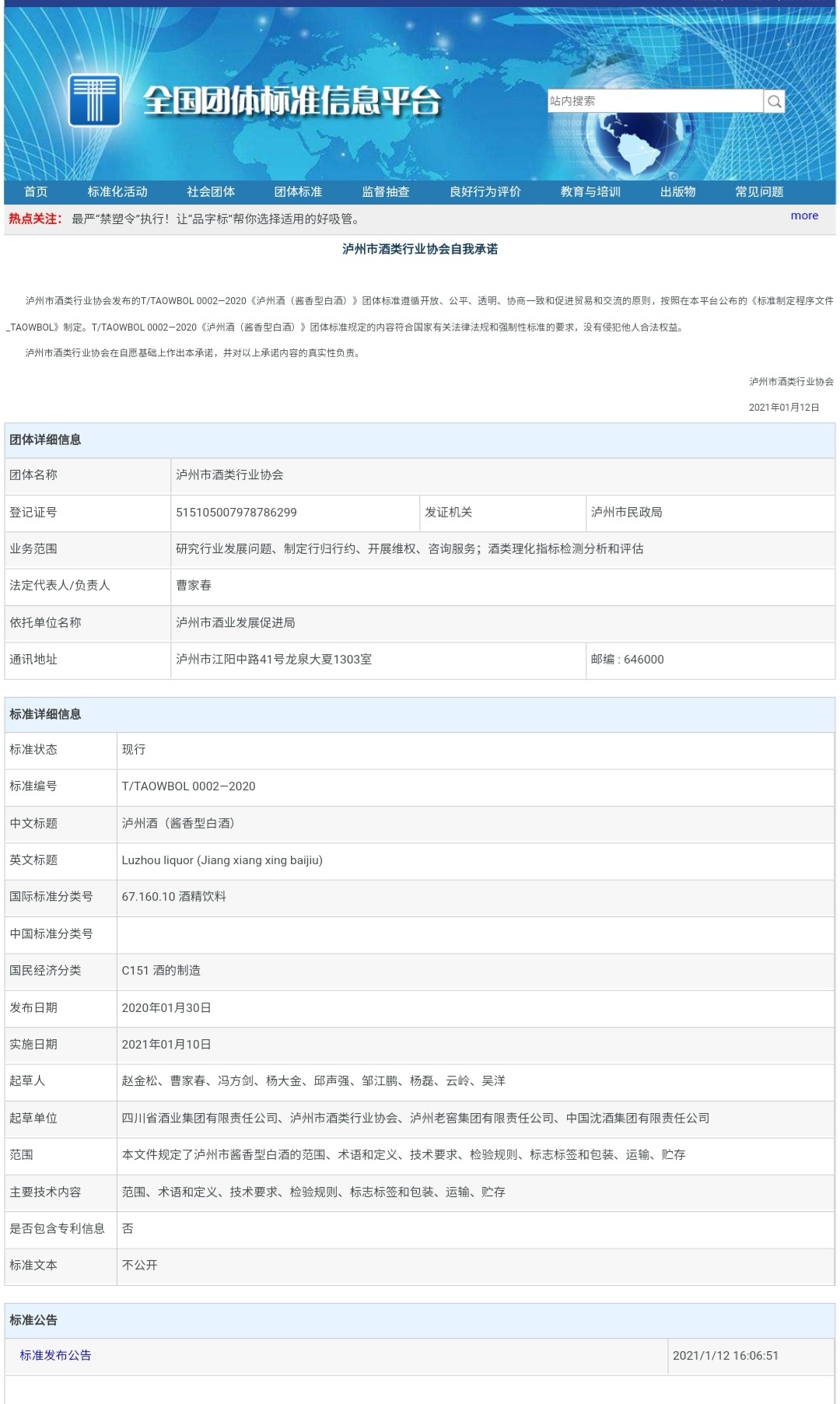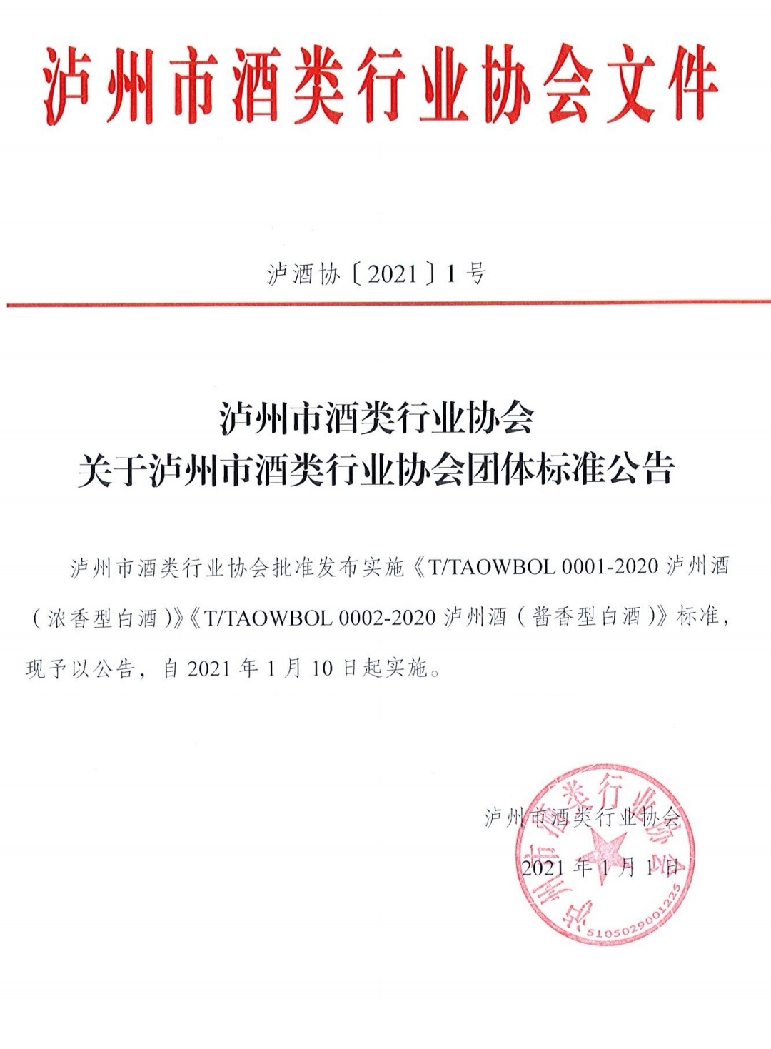 据悉,1月1日,泸州市酒类行业协会发布了《关于泸州市酒类行业协会团体标准公告》,公告指出:该协会批准发布实施《T/TAOWBOL 0001-2020泸州酒(浓香型白酒)》《T/TAOWBOL 0002-2020泸州酒(酱香型白酒)》标准,自2021年1月10日起实施,标准文本不予公开。