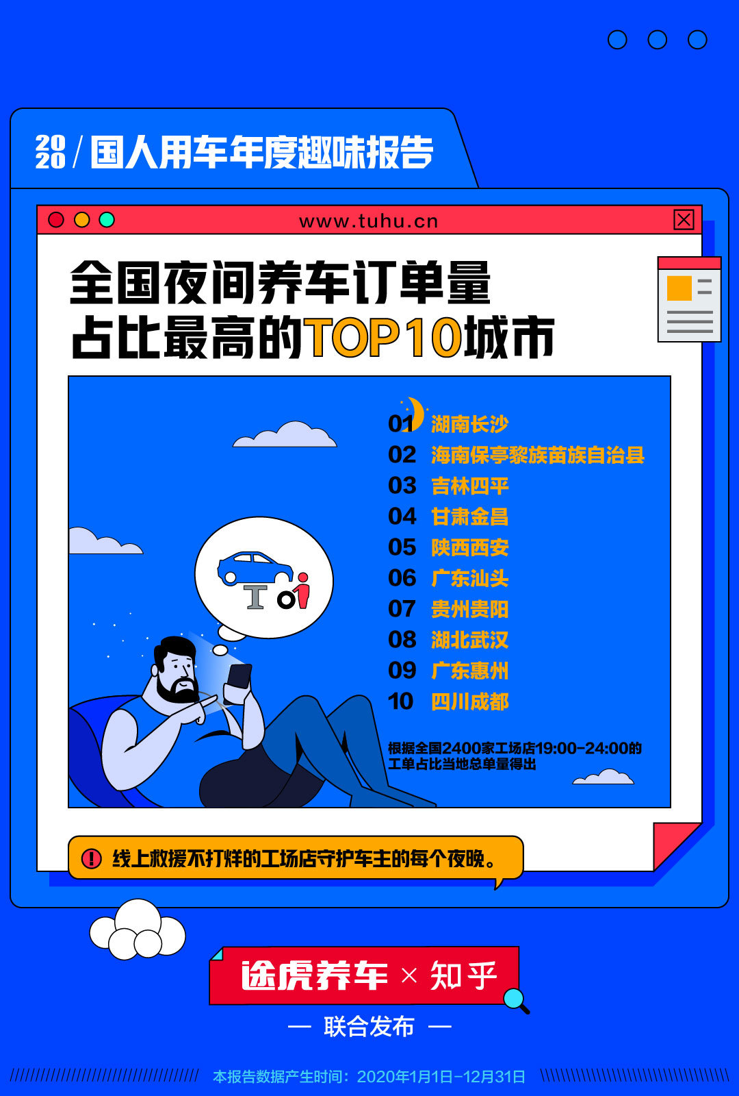 晚上7点吃完晚饭,除了散步还可以养车,人车都有夜生活——途虎养车全国2400家工场店数据显示,夜间(19:00-24:00)订单量最高的TOP10城市分别为:湖南长沙,海南保亭黎族苗族自治县,吉林四平,甘肃金昌,陕西西安,广东汕头,贵州贵阳,湖北武汉,广东惠州,四川成都。