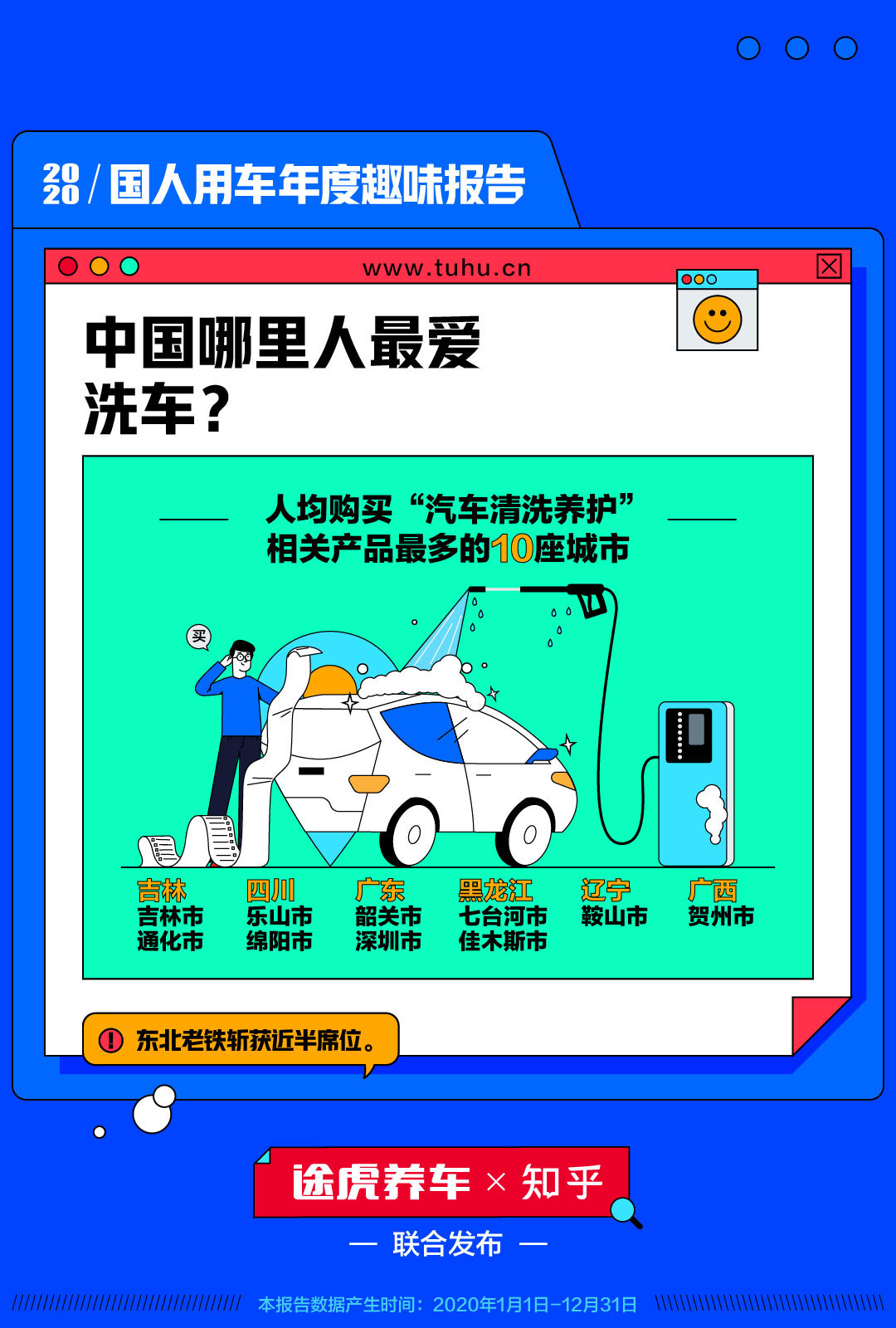 根据途虎养车全年洗车订单统计,平台车主平均每年洗车24次。最爱洗车的10地车主分别来自吉林省吉林市,四川省乐山市,广东省韶关市,黑龙江省七台河市,辽宁省鞍山市,吉林省通化市,广西壮族自治区贺州市,四川省绵阳市,黑龙江省佳木斯市,广东省深圳市,东北老铁斩获近半席位。