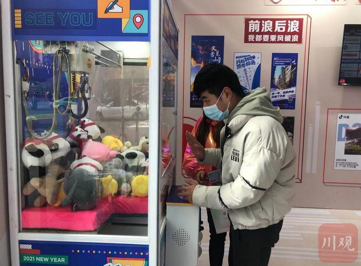 全场唯一个娃娃机也设置在该展厅,乖萌可爱的川宝玩偶,在娃娃机里就可以抓到。“运气爆棚,太开心啦!”川观粉丝现场使用娃娃机夹到心仪已久的川宝玩偶,开心拍照发起了朋友圈。