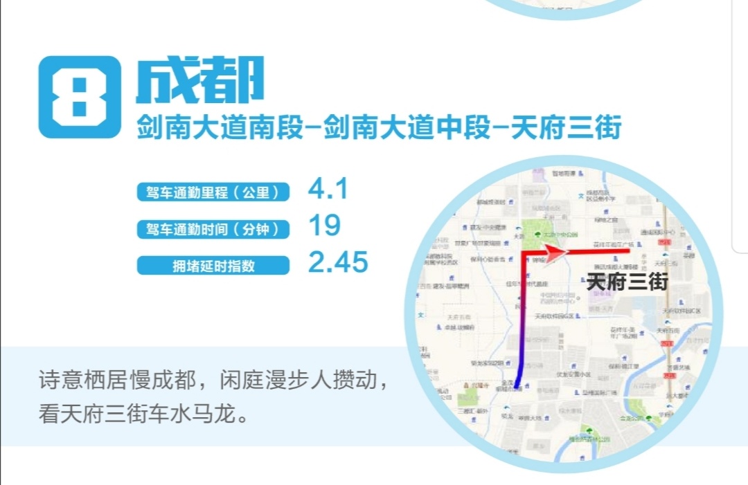 近日,高德地图联合国家信息中心大数据发展部、清华大学戴姆勒可持续交通联合研究中心等权威机构共同发布《2020年度中国主要城市交通分析报告》(简称《报告》)。报告首次对外发布“全国十大热门上班路”榜单,排名全国前十的热门通勤线路目的地多集中于城市的高新科技产业园区,其中,北京市“龙域西一路-西二旗北路-后厂村路”驾车上班热度最高,排名第一;成都的“剑南大道南段–剑南大道中段–天府三街”入围前十。