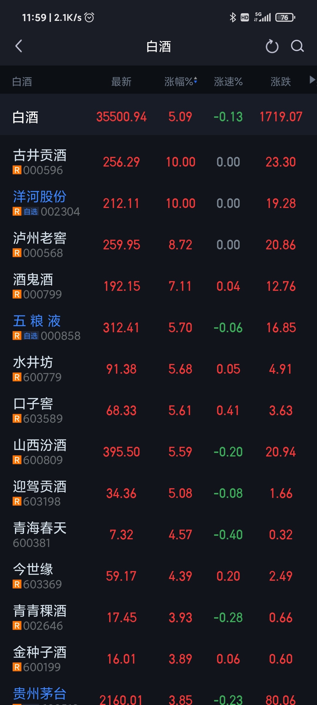 截至午间收盘,在洋河股份的带动下,古井贡酒随后涨停,泸州老窖涨8.72%,酒鬼酒涨7.11%,五粮液、水井坊涨超5%,贵州茅台涨3.85%,股价纷纷逼近前高。