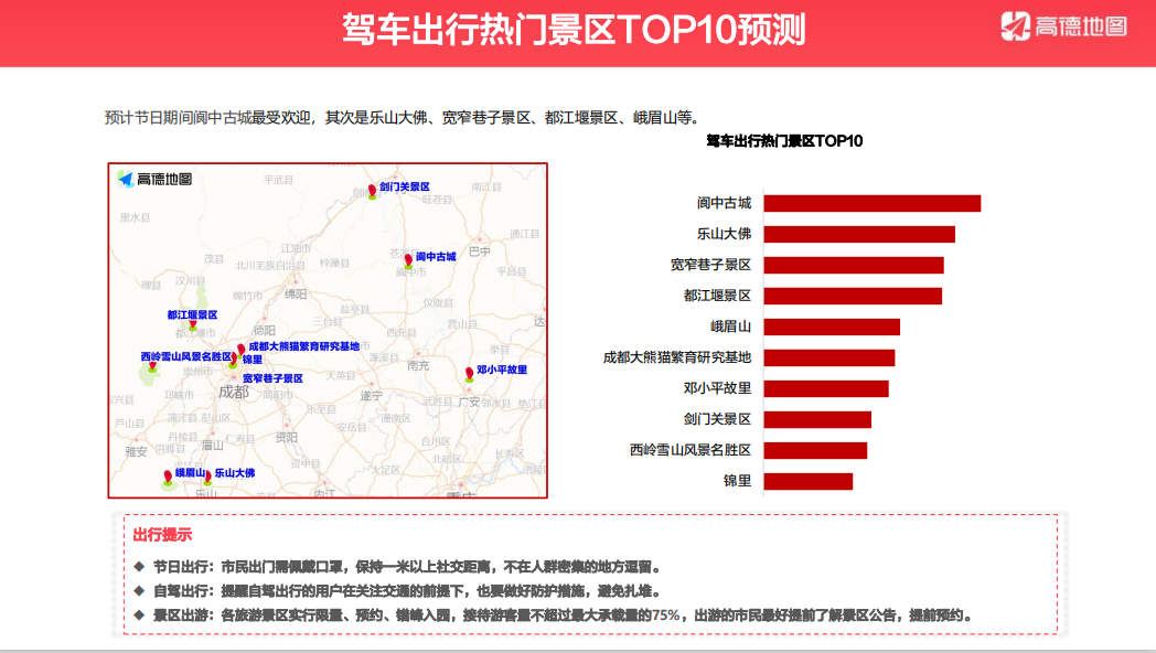 在驾车出行热门景区方面,预计节日期间阆中古城最受欢迎,其次是乐山大佛、宽窄巷子景区、都江堰景区、峨眉山等。