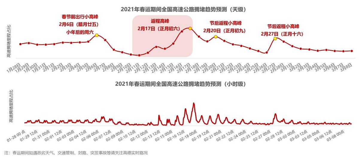 2021年春运将从1月28日(农历十二月十六)开始,3月8日(正月二十五)结束,共计40天。1月25日,高德地图联合交通运输部公路科学研究院权威发布《2021年春运出行预测报告》,报告预测,全国高速2021春运期间出行将相对分散,节前全国高速日均拥堵里程将同比去年下降约三成。四川省高速节前路况较好,出行相对分散,无明显拥堵高峰;2月17日(正月初六)为返程拥堵高峰,14点-18点拥堵程度较高。