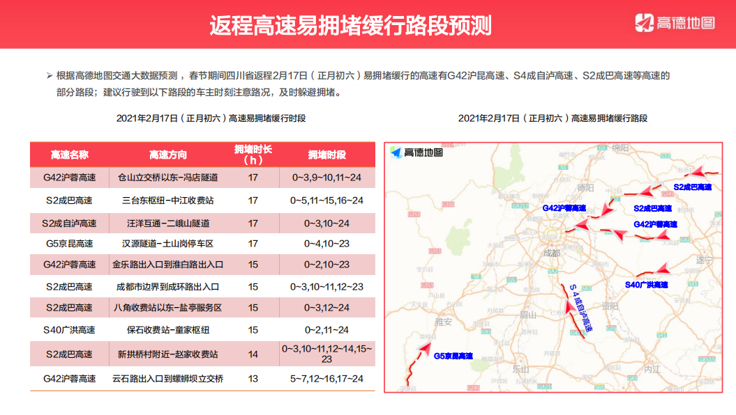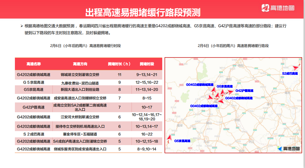 报告预测,春运期间,四川省出程易拥堵缓行的高速主要是G4202成都绕城高速、G5京昆高速、G42沪昆高速等高速的部分路段;春节期间返程2月17日(正月初六)易拥堵缓行的高速有G42沪昆高速、G4215蓉遵高速、S2成巴高速等高速的部分路段。