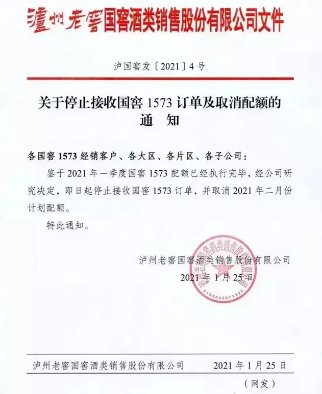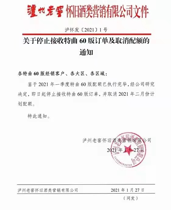 1月25日,泸州老窖国窖酒类销售股份有限公司发布停货通知称,鉴于2021年一季度国窖1573配额已经执行完毕,经公司研究决定,即日(1月25日)起停止接收国窖1573订单,并取消2021年二月份计划配额。今天,泸州老窖怀旧酒业营销有限公司发文称,即日起停止接受泸州老窖特曲60版订单,并取消今年二月份配额。