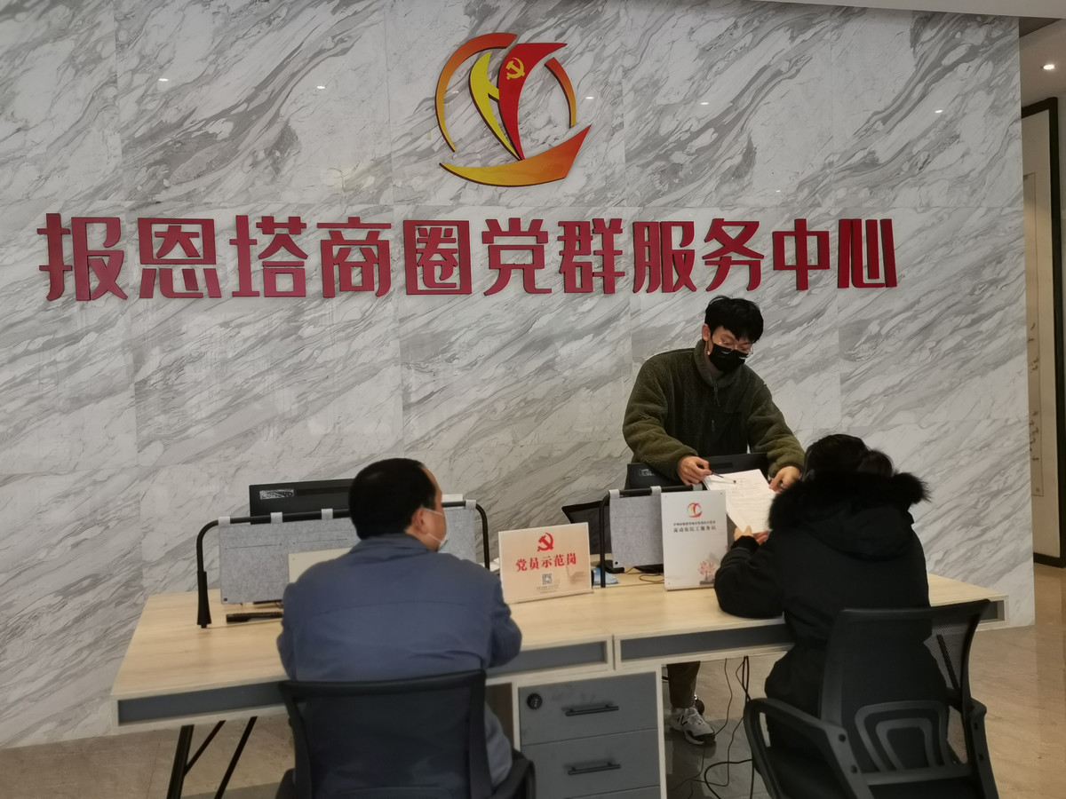 报恩塔商圈党群服务中心的工作人员正在给来办事的群众解答疑惑。刘钰汶摄