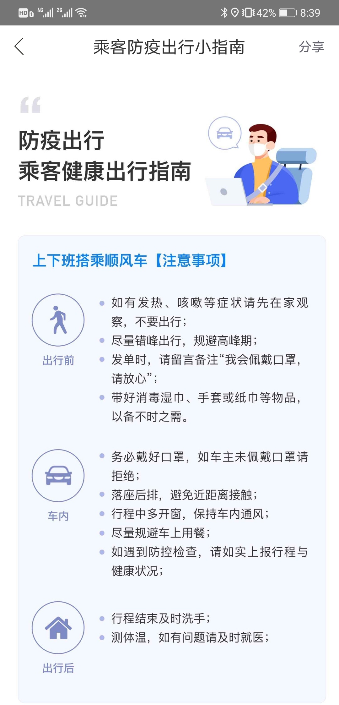 为了做好春运疫情防控工作,确保春运及春节出行的健康安全,哈啰出行在App内设置了防疫小指南提醒,同时在行程中以语音播报的形式提醒司机和乘客戴好口罩、注意防疫等。