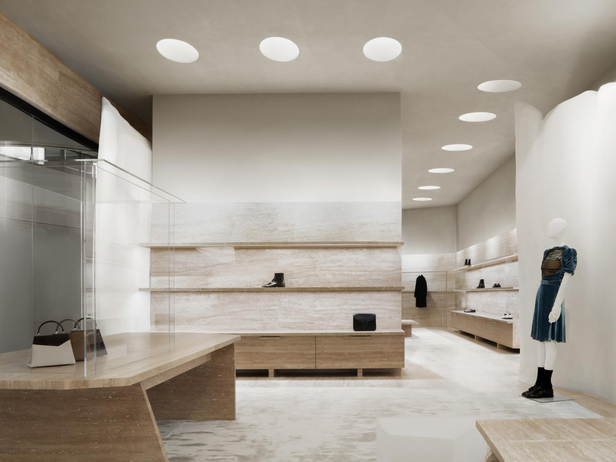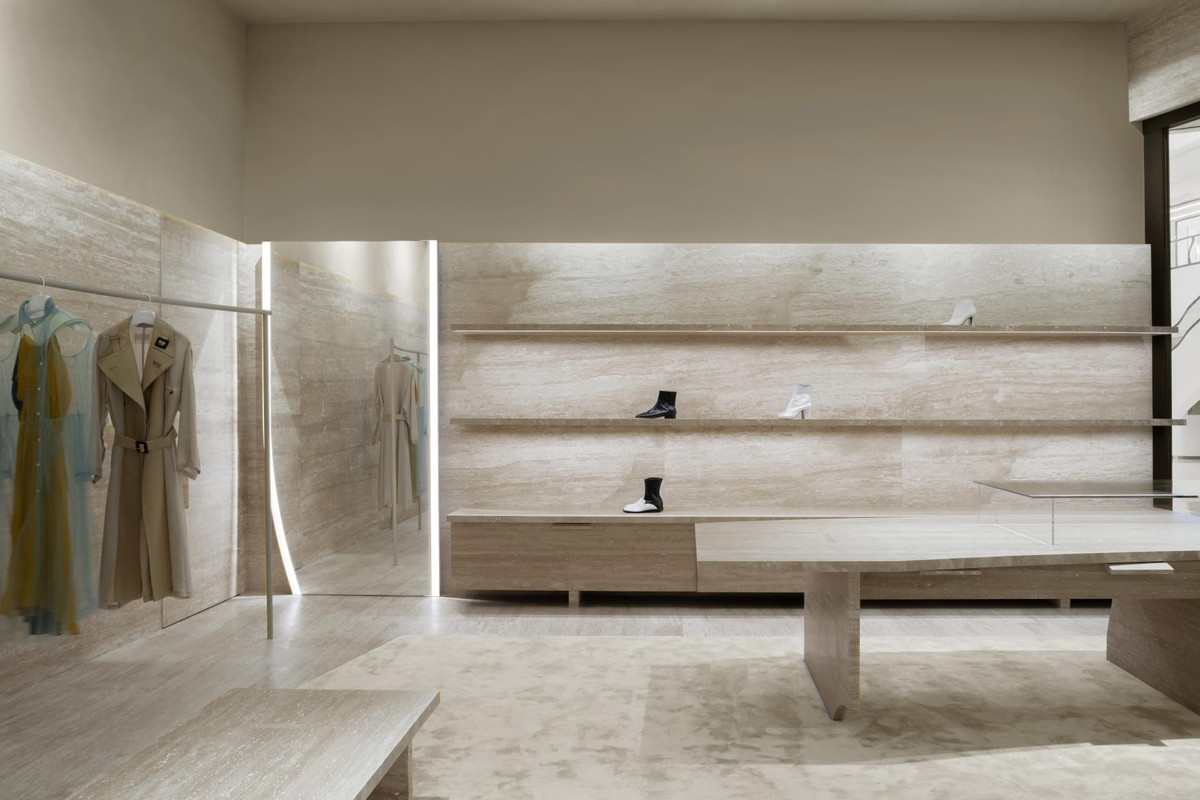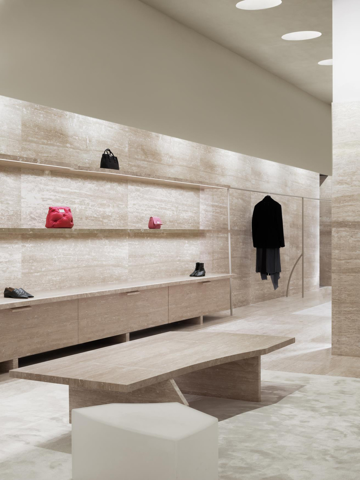 据悉,Anne Holtrop设计的首次亮相是在2018年Maison Margiela秋冬Artisanal高级定制系列秀场的石膏场景里。其在店铺外观和内部装饰上都诠释了时装屋不羁的设计理念。店铺设计根植于“将不合适变成合适”的设计语言,营造了一个既抽象又舒适的环境。