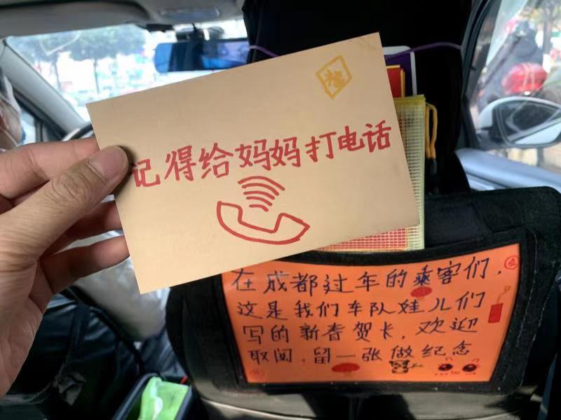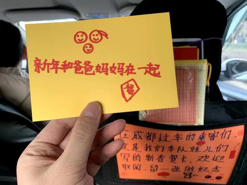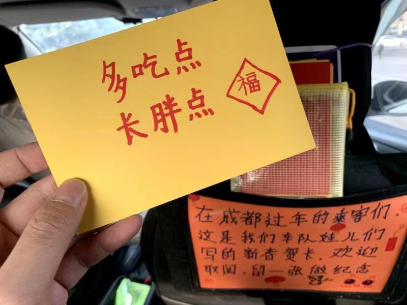 “在成都过年的乘客们,这是我们车队娃儿们写的新春贺卡,欢迎取阅,留一张做纪念。”副驾位置的后座上贴着这样的一段内容。