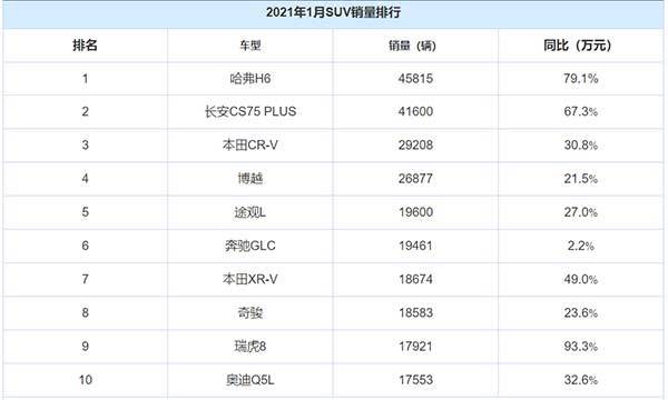 就国别来看,哈弗H6、长安CS75 PLUS、博越、瑞虎8为中国品牌选手,本田CR-V、本田XR-V、奇骏来自日系阵营,途观L、奔驰GLC、奥迪Q5L则为德系阵营。一方面,就1月榜单看,中国品牌未像以往一样占据半壁江山;另一方面,德系异军突起,大有与日系在SUV领域比肩之势。虽然这一趋势是否会延续下去暂未可知,但这一变数显然让接下来的SUV市场更加有看头。