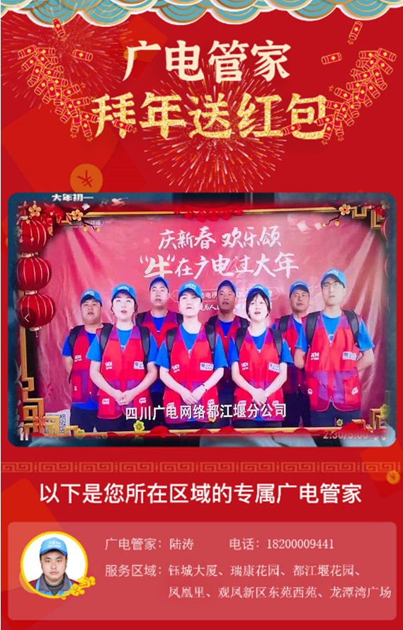 今年,为进一步落实省委宣传部关于春节文化惠民活动相关要求,广电网络公司进一步优化升级广电管家服务体系,陆续通过大众媒体、小区、营业厅、服务现场等公布广电管家信息,为全省千万家庭用户提供管家式服务。春节期间,广电互动电视上线“广电管家拜年”专区,通过“电视上的广电管家”,守护全川用户欢度春节。