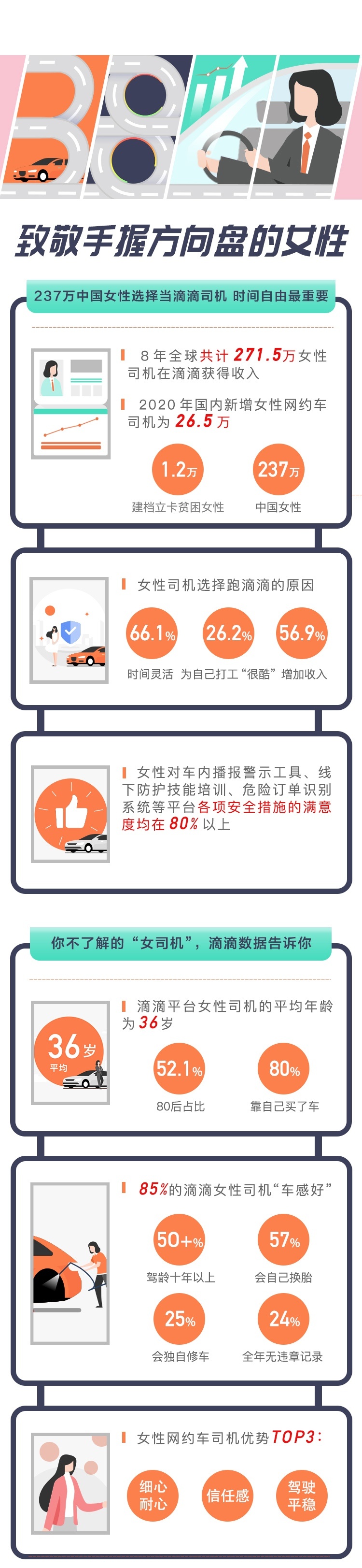 3月8日,滴滴发布《滴滴数字平台与女性生态研究报告》,报告显示,8年来,全球共有 271.5 万女性网约车司机在滴滴平台获得收入,其中包括 237 万中国女性,1.2 万名来自建档立卡的贫困家庭的女性。尤其是2020年以来,国内新注册的女性网约车司机超过了26.5万。据调研,女性网约车驾驶员中24%全年无交通违章记录,女性司机的优质服务在滴滴平台上获得乘客普遍好评。