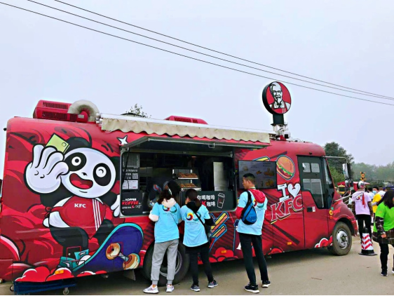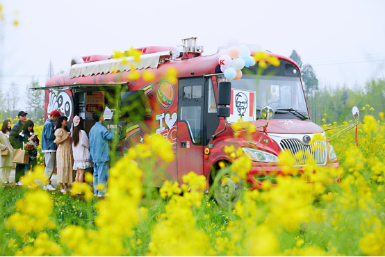 在3月12日开幕的第九届四川·崇州自驾赏花节上,肯德基餐车作为“特邀嘉宾”亮相,吸引了众多目光:以红色为主色调的车身上绘制了代表成都的“大熊猫”和多款肯德基美食,随车售卖的产品以汉堡、鸡翅、冰淇淋和饮料为主。炫酷的车型,方便的就餐环境,让你在大自然里就能唱着歌儿吃炸鸡!参加开幕式的志愿者小刘说:“没想到在菜花田里就能吃到肯德基,真是太开心了!”