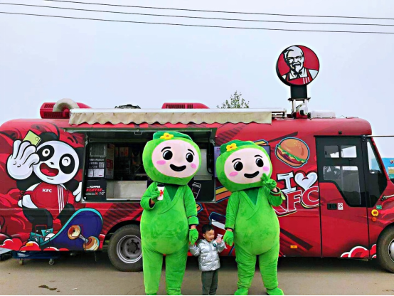 崇州吉祥物崇崇和州州在肯德基餐车前与市民合影