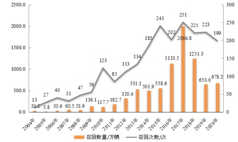 近日,市场监管总局发布了关于2020年全国汽车和消费品召回情况的通告。通告显示,2020年,我国共实施汽车召回199次,涉及车辆678.2万辆,其中,不合理危险问题仍是引发召回的主要原因,涉及车辆596.5万辆。