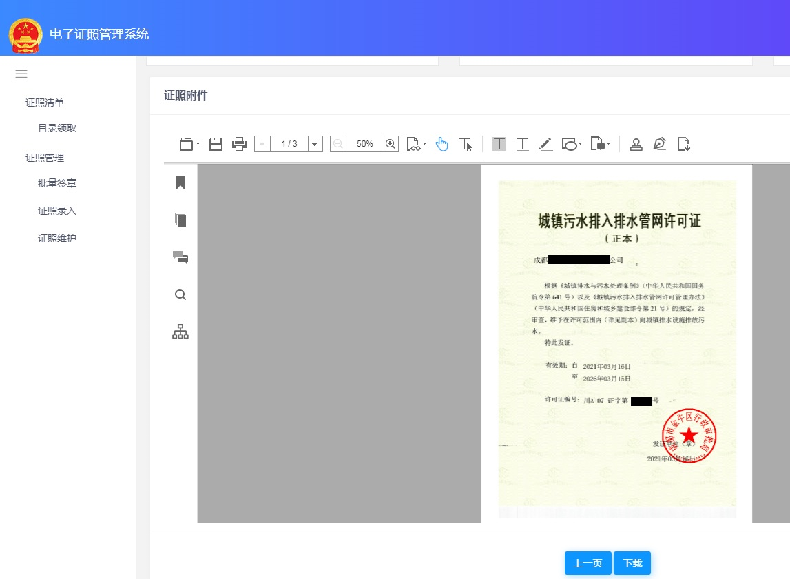 3月18日,四川在线记者从成都市金牛行政审批局获悉,近日金牛区发放了成都市首张城镇污水排入排水管网许可证电子证照。