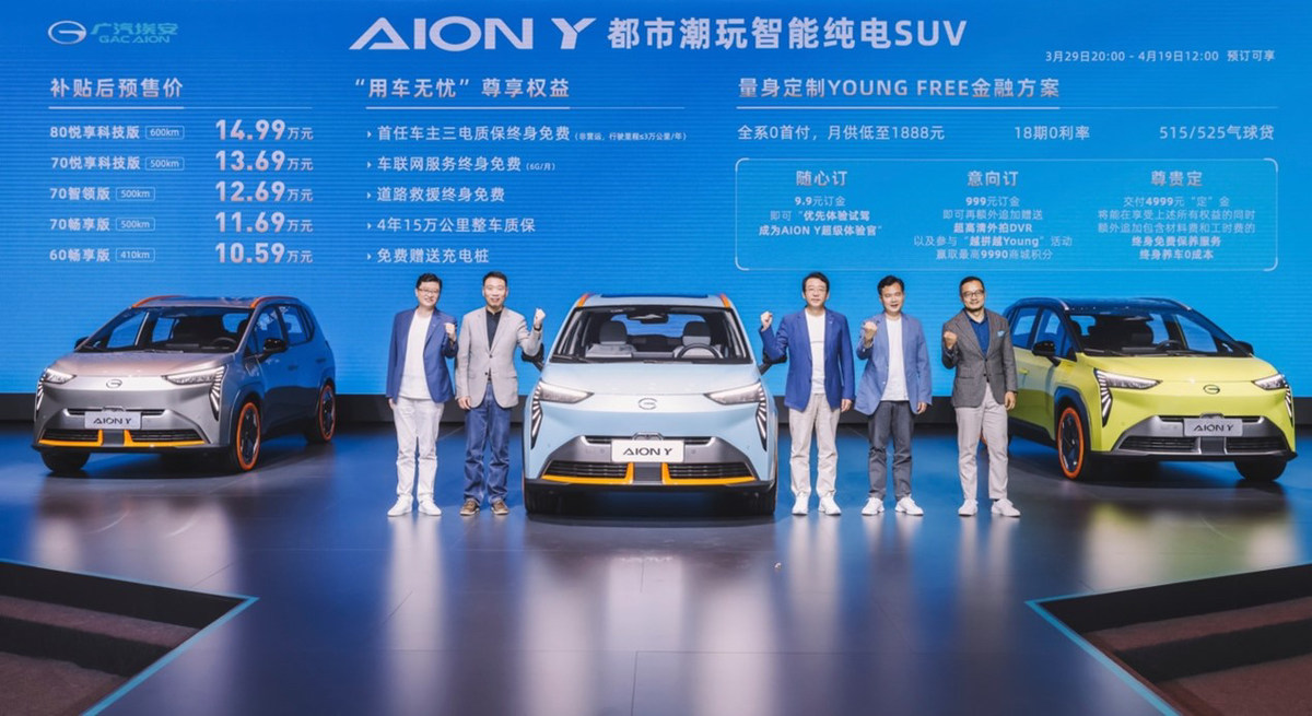 3月29日,广汽埃安AION Y智能纯电SUV 预售发布会在杭州举行,AION Y将推出畅享版、智领版以及悦享科技版共计5款车型,覆盖410km、500km、600km三种续航里程,补贴后预售价格为10.59万元起。