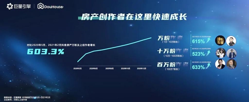 房产用户持续向线上转移的同时,房产类企业号、创作者、粉丝人群等也在快增长。截至2021年3月23日,抖音房企企业号粉丝数量超过2.6亿,同比增长528.9%;创作者方面,对比去年5月,今年2月抖音房产万粉及以上创作者增长了603.3%,百万粉创作者增幅633%。