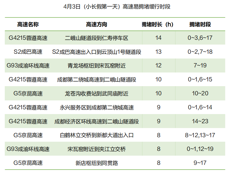 返程易拥堵缓行的高速主要是G4215蓉遵高速、G4202成都绕城高速、G5京昆高速等部分路段。