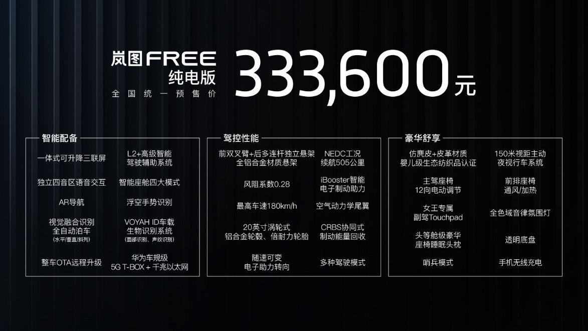 3月31日,岚图FREE正式开启预售,该车定位为性能级中大型智能电动SUV,同步推出增程电动版和纯电动版2款车型,售价分别为31.36万元和33.36万元。