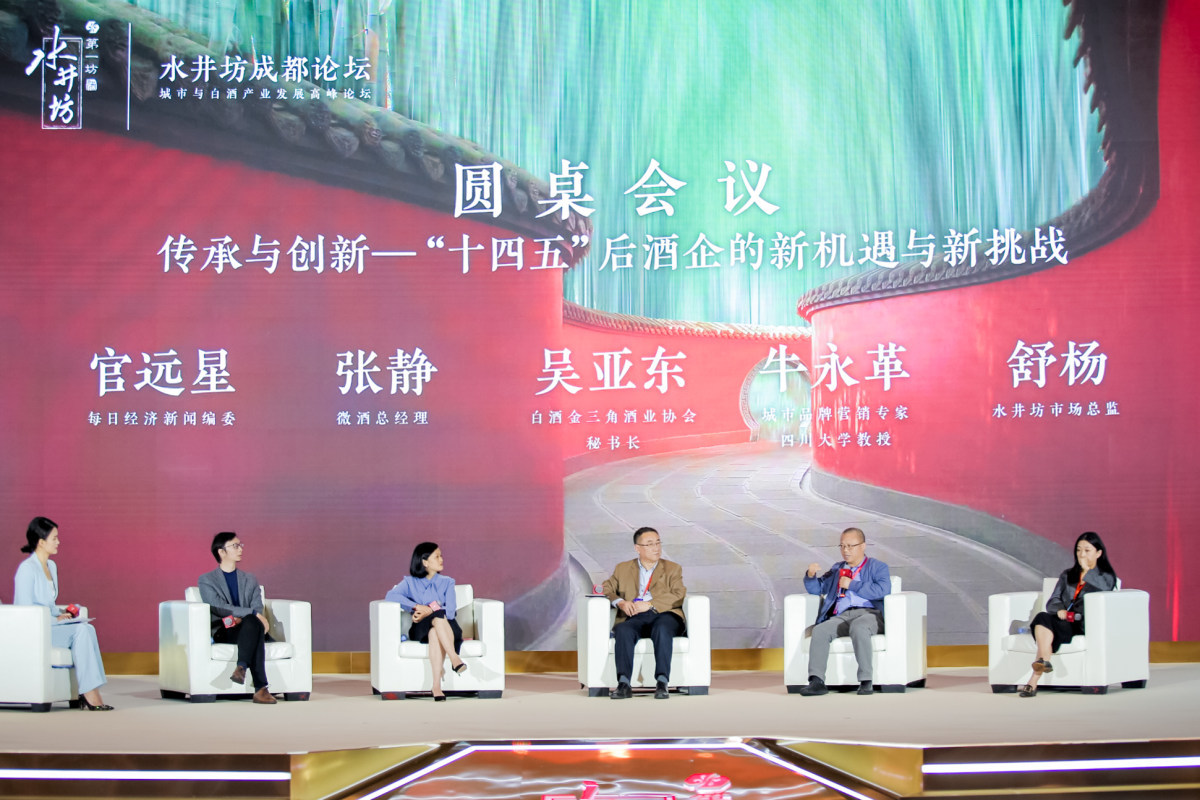 此外,作为本次论坛的重头戏,圆桌对话环节更是精彩纷呈。四川中国白酒金三角协会常务秘书长吴亚东、北京微酒世纪文化传媒有限公司总经理张静、每日经济新闻编委官远星、城市营销专家牛永革及水井坊博物馆馆长王刚等专家学者围坐在一起,以《传承与创新——“十四五”酒企的新机遇与新挑战》为题展开论道。