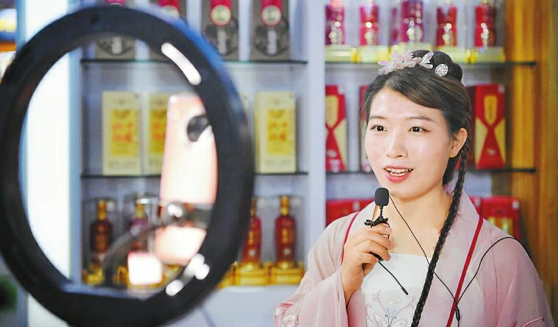4月7日,第104届全国糖酒商品交易会现场,商家通过直播进行宣传推广。 记者 杨树 摄