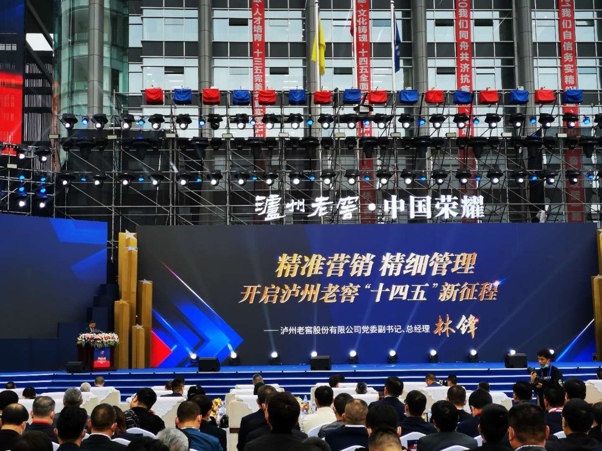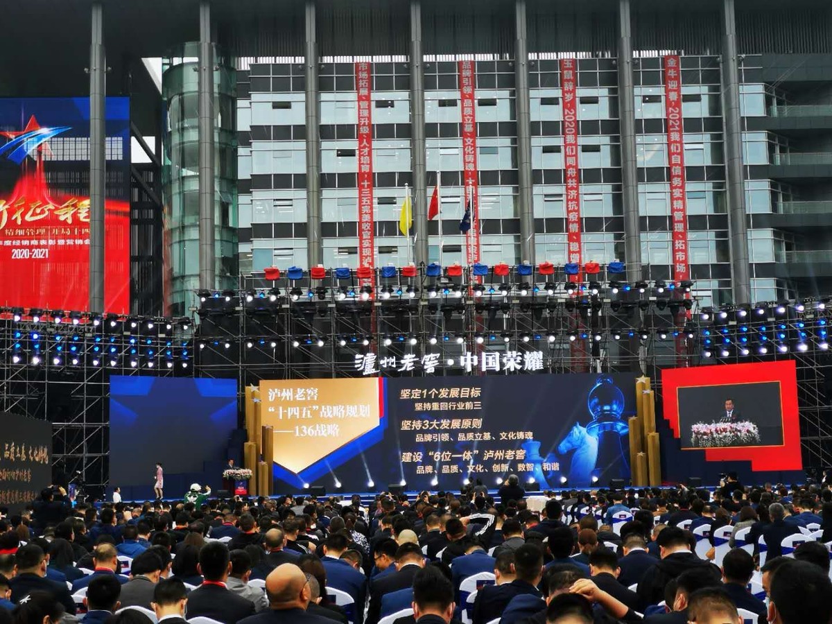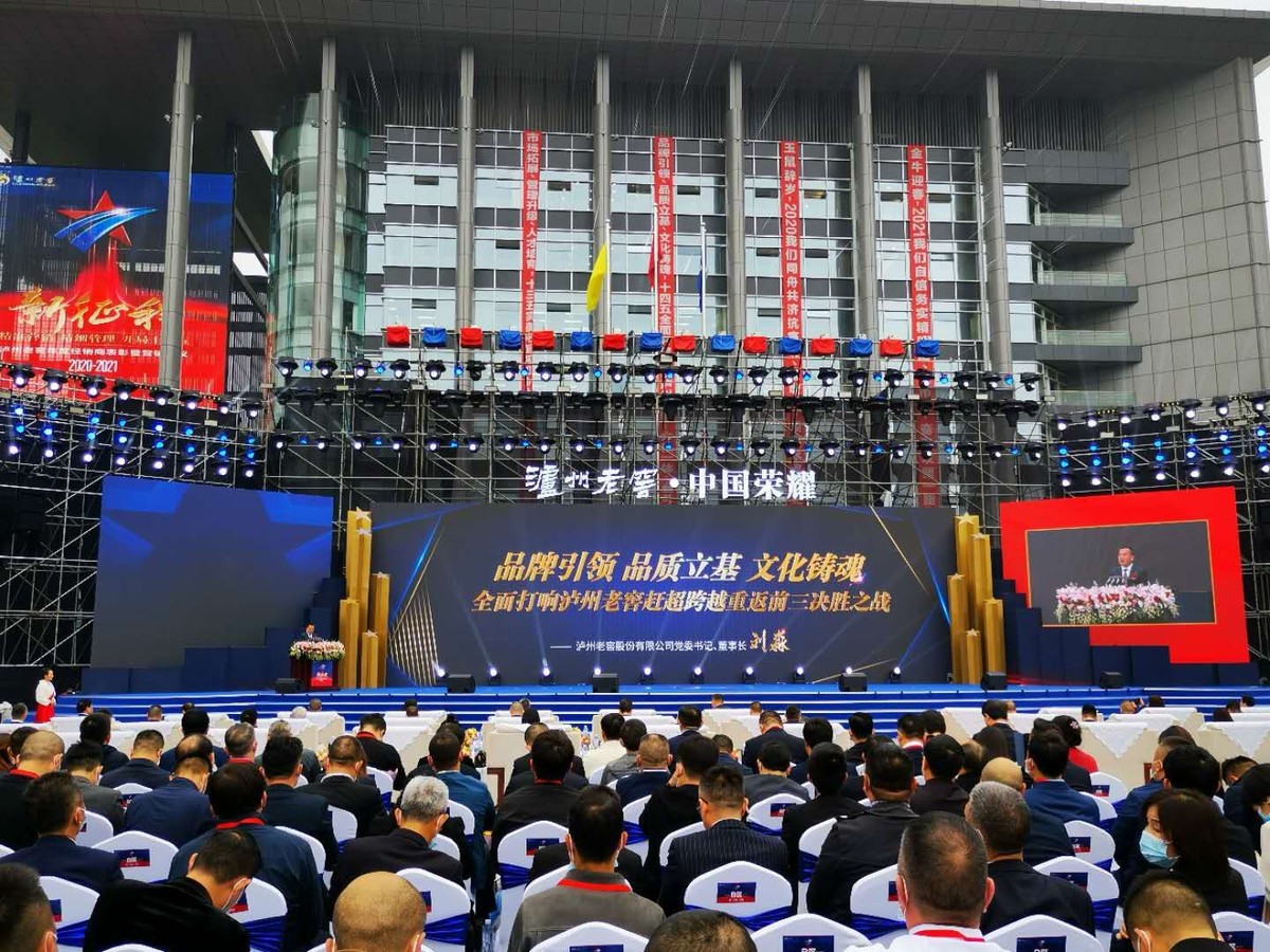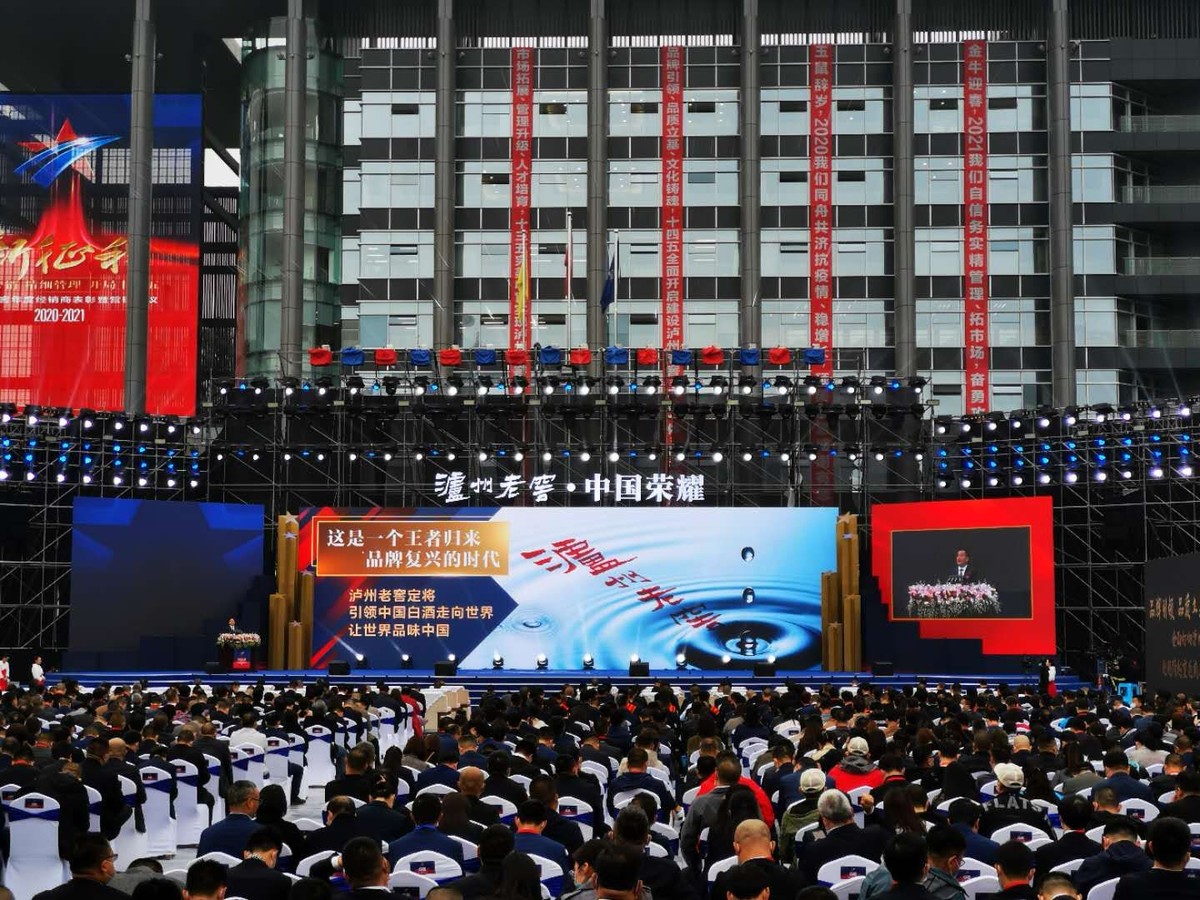上午9时许,偌大的国窖广场座无虚席,气氛热烈。主席台眺台悬挂着“市场拓展、管理升级、人才培育”“品牌引领、品质立基、文化铸魂”“新征程——精准营销、精细管理、开局十四五”等大会主题标语,在热烈的掌声中,2020-2021泸州老窖年度经销商表彰暨营销会议拉开序幕。
