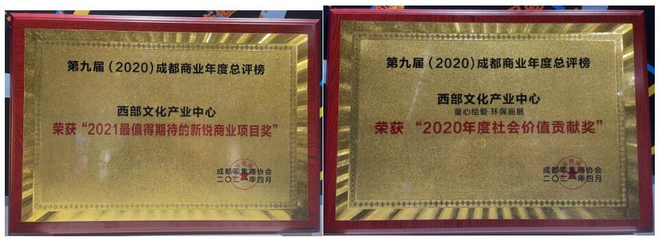 4月14日,在第九届(2020)成都商业年度总评榜颁奖仪式上,西部文化产业中心荣获“2021最值得期待的新锐商业项目奖”和“2020年度社会价值贡献奖”。