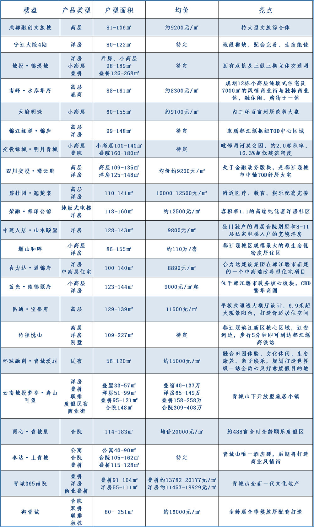 今年还值得关注的主城楼盘里,紧邻走马河绿道、成灌高铁的城投·锦溪城拥有洋房、小高层和叠拼;都江堰枢纽TOD中心区域的锦江绿道·锦庐无论是商业、医疗、教育或是生态环境都富足;内二环的百亩河居改善大盘天府明珠提供60-155平方米的户型……