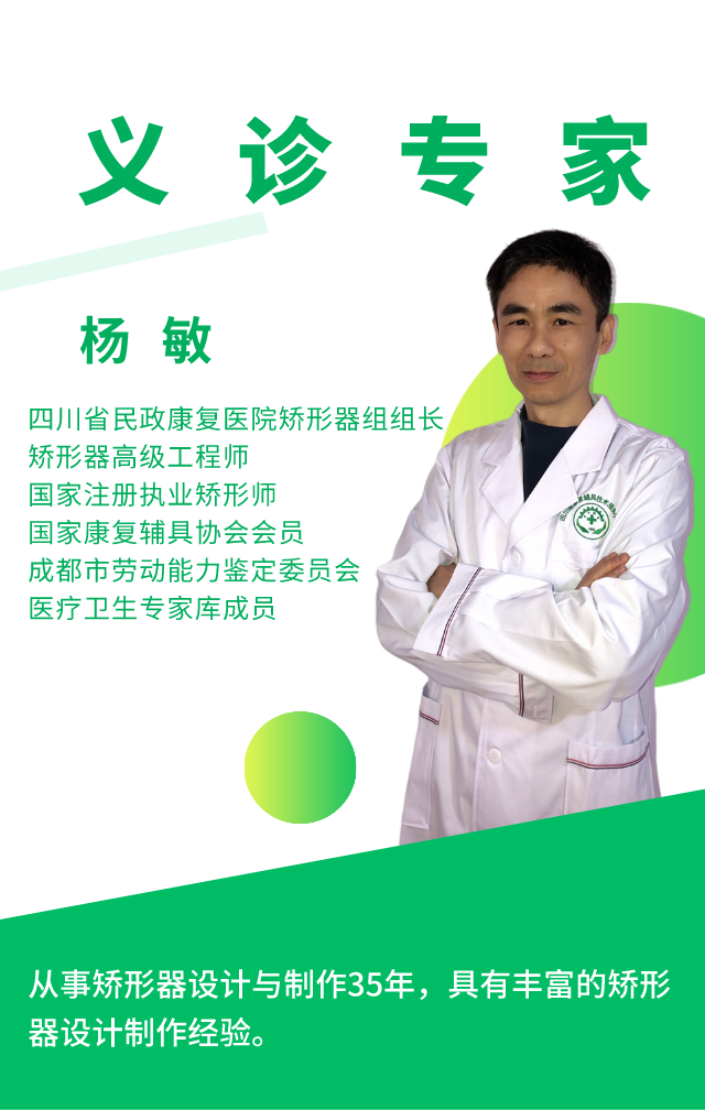 目前活动专家组已经确认人员名单——成都市第三人民医院骨科主任梁益建为此次活动专家组组长;成都市第三人民医院关节创伤医生梁炜、罗静,民政康复医院骨科医生杨淞、矫形器工程师杨敏、矫形器工程师徐源、放射科医师胡学强为此次活动专家组成员。