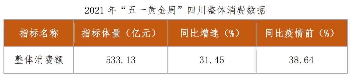 据映潮大数据监测显示,2021年“五一黄金周”期间,四川消费市场持续活跃。旅游、餐饮、休闲娱乐消费人气旺盛,商品消费市场热度迅速攀升。四川整体消费累计实现533.13亿元,同比增长31.45%,与2019年相比增长38.64%(今年“五一”假期相较于2019年多一天,下同)。