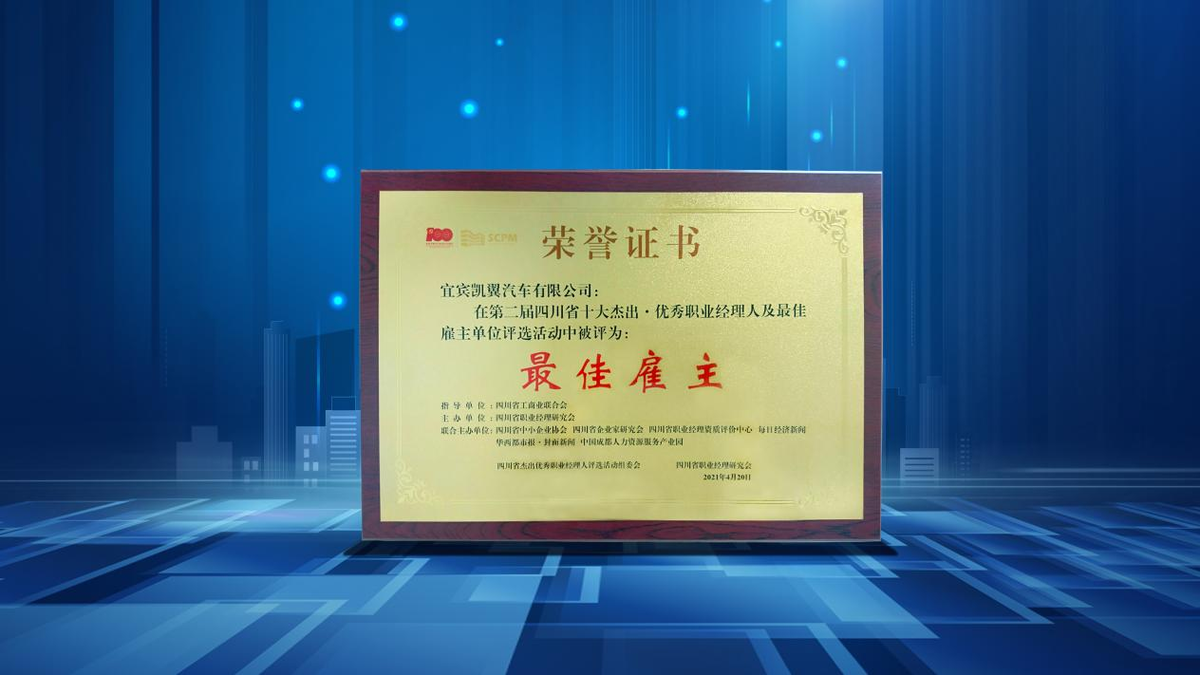 据悉,“第二届四川省最佳雇主”评选活动由四川省工商联指导、四川省职业经理研究会发起,旨在甄选、表彰2020年度四川省具有杰出贡献的最佳雇主。凯翼汽车凭借出色的人才战略及不断精进的组织效能荣获“最佳雇主”称号,是对凯翼汽车良好雇主形象的肯定,也是对其坚持秉承“以人为本”的理念的良好社会反响。
