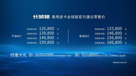 在配置上,长城炮全球版搭载的长城自主研发的2.0T汽油机和柴油机,动力充沛,TOD智能四驱系统让长城炮轻松应对各种路况。