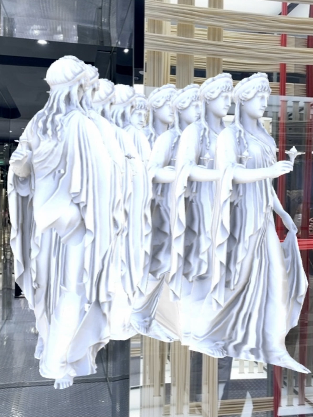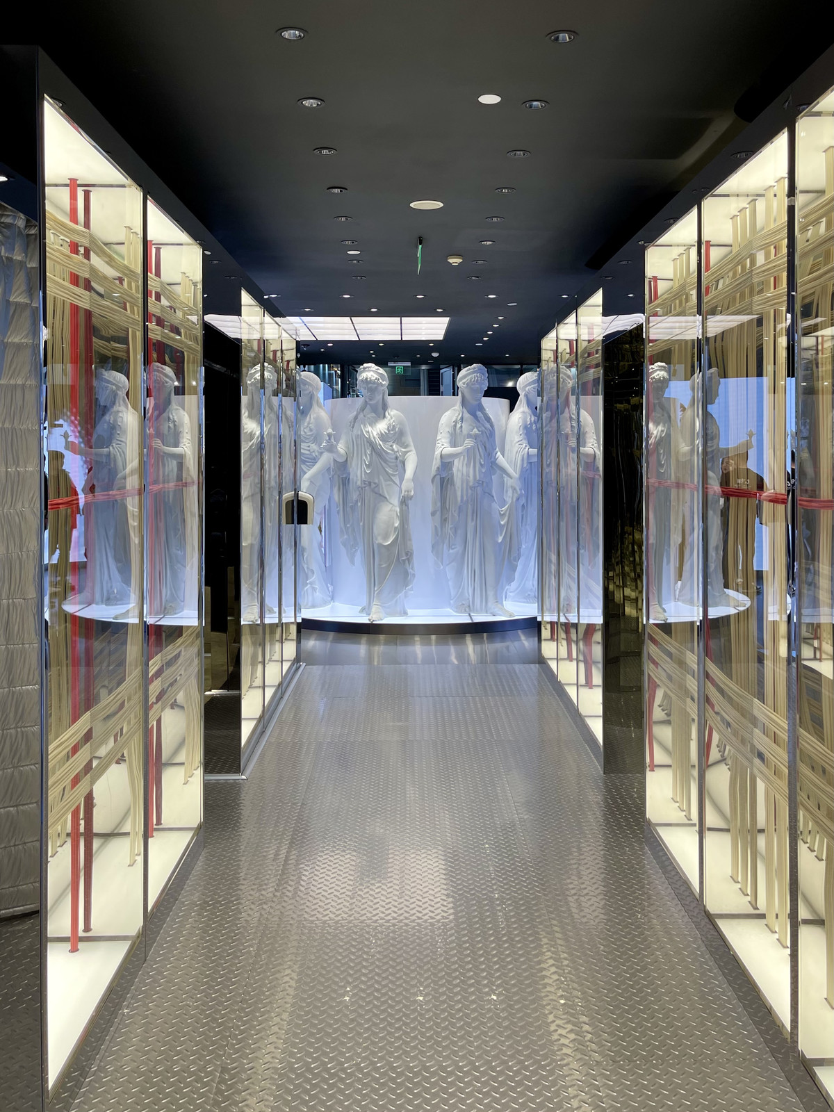 四川在线记者现场看到,通过3D打印技术制作而成的古希腊雕塑,呈现了古典主义的现代诠释;快闪店内大量采用了Riccardo Tisci偏爱的镜面等设计元素,并通过捕捉和融合四川竹艺文化,将这间快闪店打造成了全球范围内“最成都”的一间品牌限时精品店。