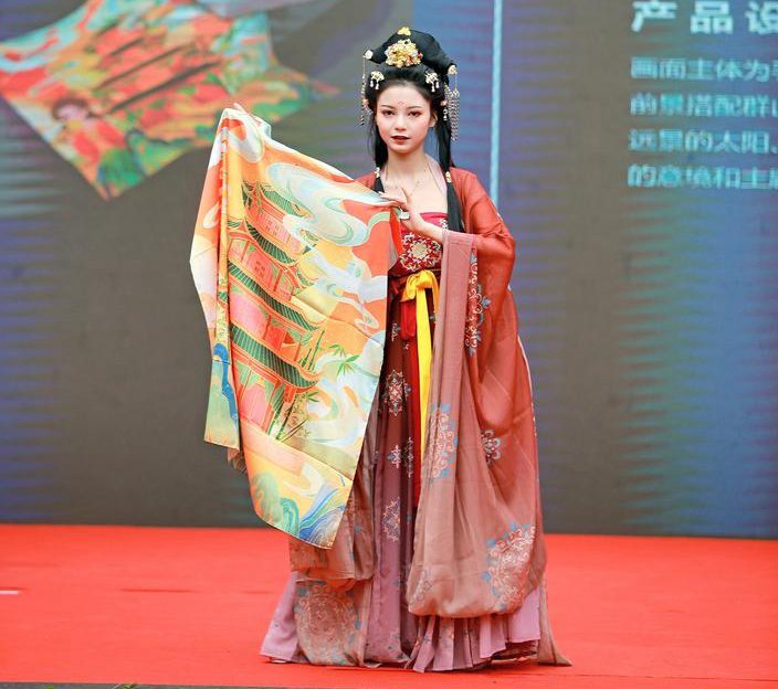 在文创产品发布环节中,三位身着汉服的扮演者走上舞台,分别向大家展示了各自人物形象的专属文创产品,包含古风油纸伞、折叠纸扇、丝巾、冰箱贴、文创包等。