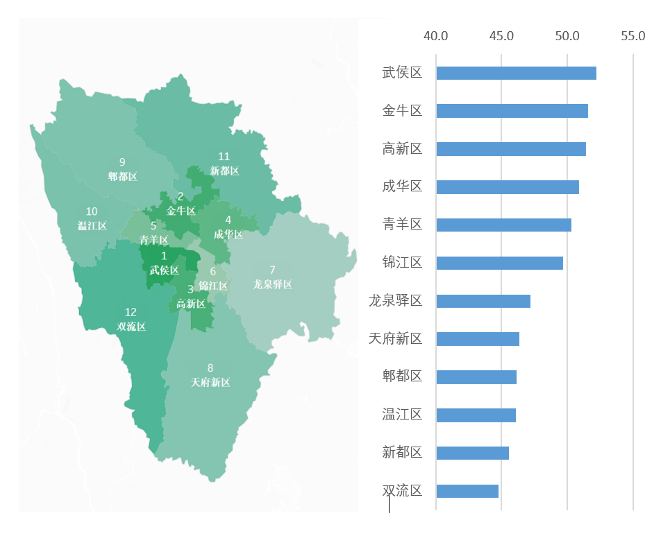从成都行政区分别来看,武侯区位列居住竞争力指数榜首,金牛区、高新区紧随其后,居住竞争力指数分别为52.2 、51.6、51.4。