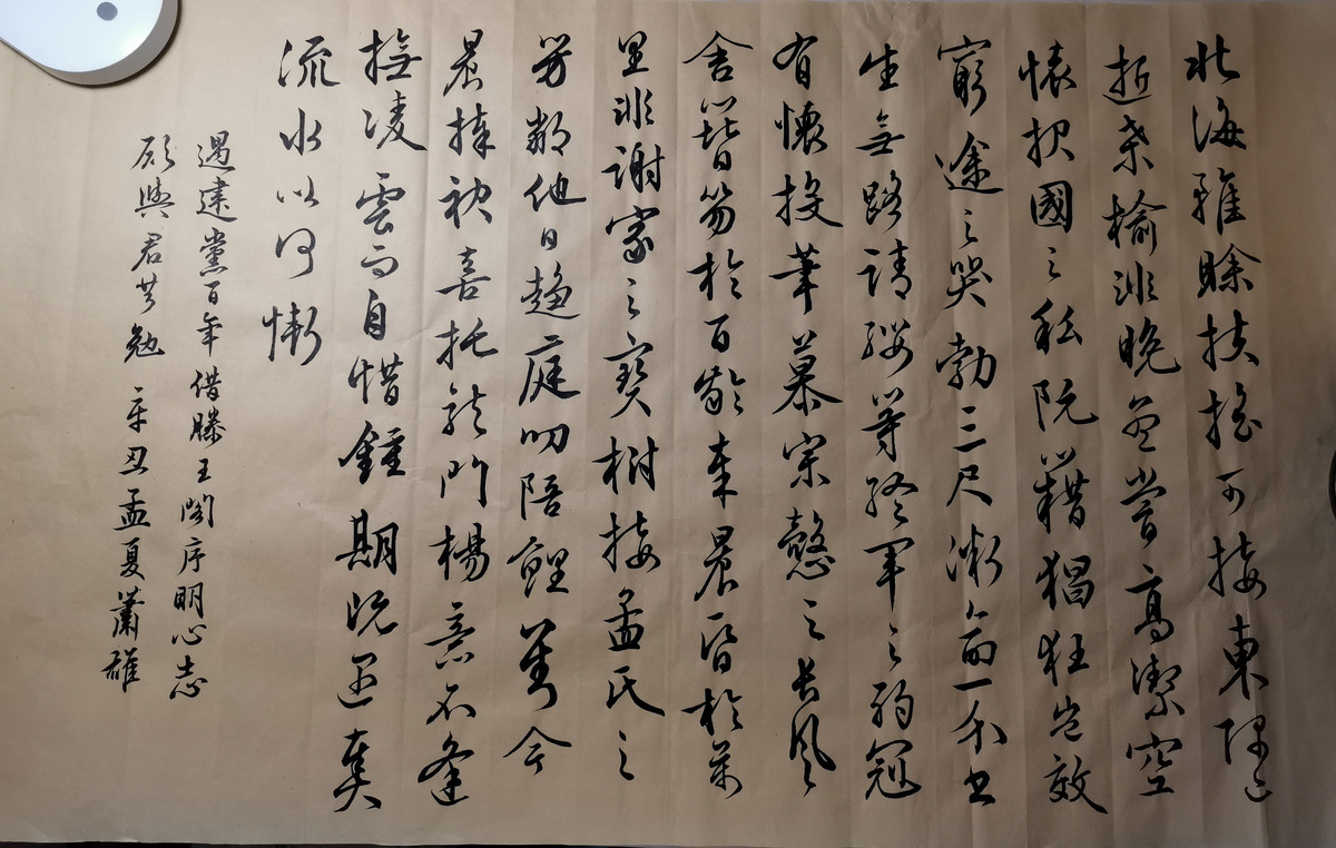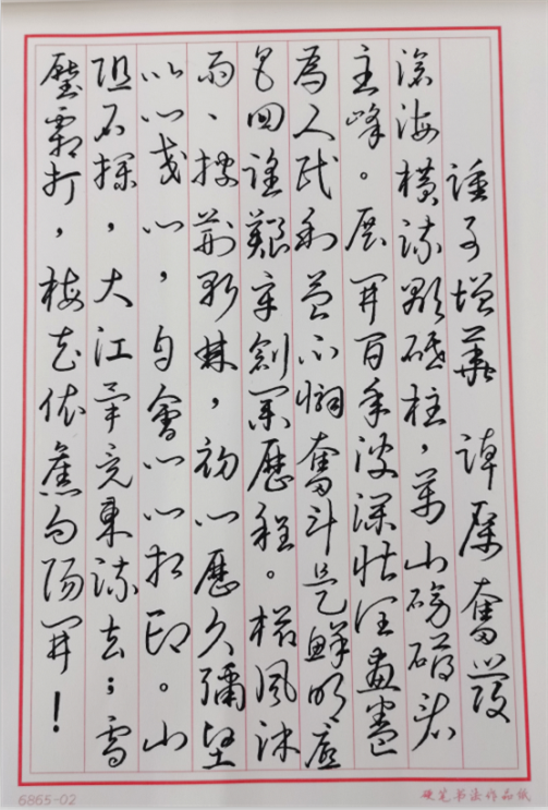 志当存高远,路自脚下行。建党以来我们的革命前辈就为中国革命、中国共产党谋出路谋未来而抛头颅、洒热血,写下壮丽的诗篇。现在后世的我们能从他们留下的足迹中窥探到前辈们伟大的革命抱负,也深深地为他们追求卓越、坚韧不拔的精神感动着。 这幅作品由行书写成,规格为79mm*48mm,内容特选自《滕王阁序》,两行小字落款,字大款小,格调统一,期望借此内容讴歌革命前辈哪怕在困境之中仍不放弃理想砥砺前行,让我们青年大学生深受鼓舞,也愿以此自勉。